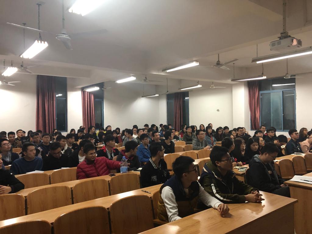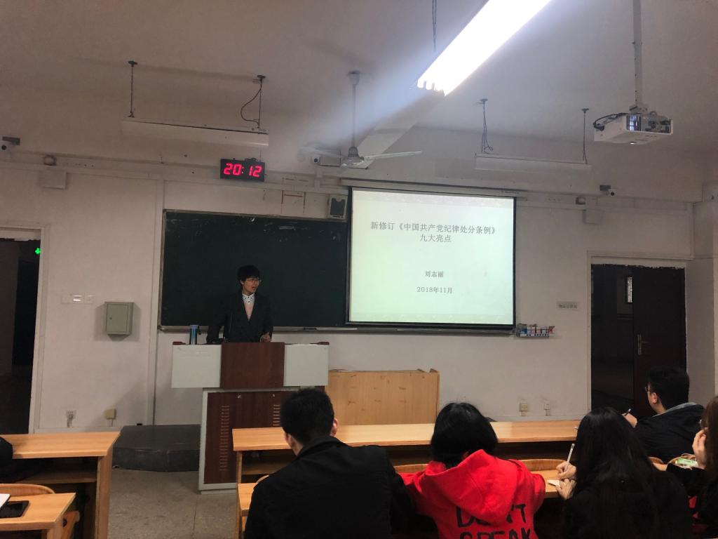 2018年11月14日晚,在雁山校区06301教室,学院党委副书记刘志丽为全体学生党员上党课,学习新修订的《中国共产党纪律处分条例》。