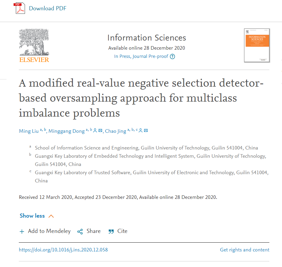 近日,我院计算机科学与技术专业2018级硕士研究生刘明同学以第一作者在《Information Sciences》(中科院分区1区,TOP期刊,IF=5.91)上发表了题目为“A modified real-value negative selection detector-based oversampling approach for multiclass imbalance problems”的研究论文(DOI:10.1016/j.ins.2020.12.058),实现了学院信息类硕士研究生发表高水平论文的新突破。 多类不平衡学习是当前机器学习和深度学习领域面临的重大挑战,该文将实值否定选择思想用于上采样方法设计,构造出便于学习的数据集,较好的解决了这一难题。论文主要工作在于对实值否定选择算法进行了改进,并将其融入到上采样方法中,提出了监督机制这一概念,可以很好地防止传统上采样方法过度泛化问题。此外,论文还基于拥挤密度方法和实值否定选择算法提出了一种有效的权重选择方法来减轻类内分布不平衡。该研究为当前多类不平衡学习研究提供了一种有效的解决方法。 近年来,学院紧紧围绕学校第三次党代会精神提出的“一流学科”建设目标,狠抓硕士研究生培养质量,积极引导和鼓励研究生开展创新性研究,加强学术训练,不断提升研究生培养质量和科研创新能力。刘明同学是我校2014级计算机科学与技术专业本科生,在董明刚教授的精心指导下,他本科毕业设计期间就发表了中文核心期刊论文。在攻读硕士期间,他潜心钻研,踏实工作,研究工作取得了重要进展,目前已经完成3篇高质量论文。近年信息科学与工程学院硕士研究生先后在《Information Sciences》、《Journal of Systems and Software》、《Neurocomputing》、《Frontiers of Information Technology & Electronic Engineering》等国际国内重要期刊发表多篇高质量SCI收录论文,这是学院研究生培养改革取得积极成效的重要体现。 论文链接:https://www.sciencedirect.com/science/article/pii/S002002552031224X https://doi.org/10.1016/j.ins.2020.12.058 论文在线发表情况