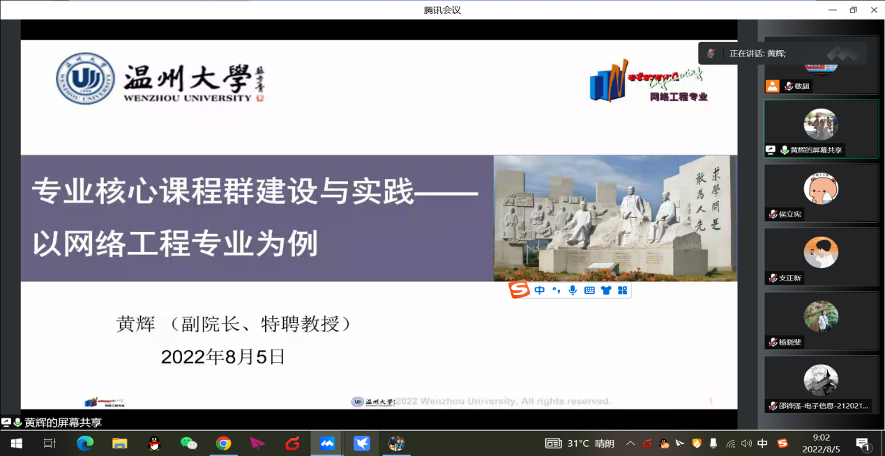 为加强学科建设,2022年8月5日信息学院邀请了温州大学计算机与人工智能学院特聘教授黄辉副院长以专业核心课程群建设与实践——以网络工程专业为例,重点分享了如何面向新工科人才培养需求,遵循学生中心、产出导向、持续改进理念,优化人才培养目标与毕业要求,重构课程体系,实施专业核心课程群的一流建设,促进网络工程新工科深化的路径与方法。 温州大学特聘教授黄辉报告部分截图 接着,桂林电子科技大学教授,博士生导师,桂林电子科技大学特设二档周祖鹏老师的报告主要介绍了团队与国际知名学者合作的主要研究成果,同时,讲座还将介绍团队在仿生机器人领域授权的多项发明专利。最后,讲座将重点介绍目前比较前沿的仿生学研究现状。 桂林电子科技大学周祖鹏教授部分截图 最后,天津理工大学教授,博士生导师,中国计算机学会(CCF)理事、杰出会员、杰出讲者、CCF虚拟现实与可视化专委会主任,智网互联实验室创始人罗训教授以南海生态系统数字孪生探索与进展为题,主要讲述了其科研团队通过与海洋科学团队密切协作,在南海生态系统数字孪生方面取得了一定的进展,并已建立了与加勒比海沿岸国家等科研团队的合作关系,将基于南海的数字孪生成果应用到一带一路生物多样性保护工作中。