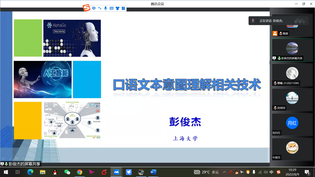 华南理工大学余志文教授报告部分截图(1/2) 华南理工大学余志文教授报告部分截图(2/2) 之后,上海大学博士生导师,彭俊杰教授的报告题目为口语文本图理解相关技术,主要结合了物流智能客服系统研发过程中碰到的用户语言成分缺失、文本错误等影响意图理解的情况,探讨了在语义信息扩展、语义相似度计算、文本错误处理与意图识别方面的相关工作。 上海大学彭俊杰教授报告部分截图