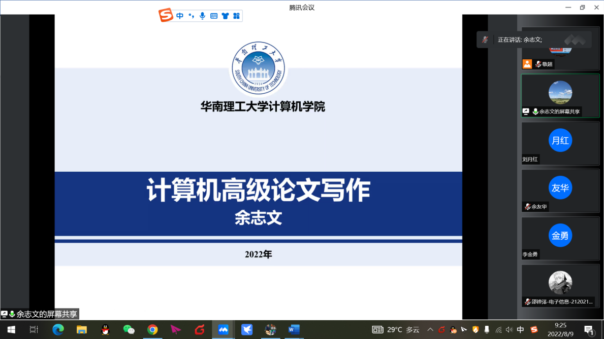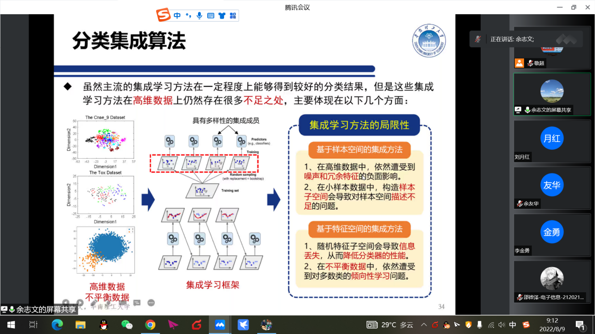 随着集成学习与自然语言处理的广泛应用,2022年8月9日信息学院先邀请华南理工大学计算机学院教授、博士生导师、国家级人才余志文教授报告,首先简要介绍各种类型的集成学习模型,主要包括分类集成学习模型、半监督集成学习模型、半监督聚类集成模型、聚类集成模型。然后,以自适应集成框架、渐进式集成框架和基于图论的聚类集成算法为核心,系统地介绍近年来余志文博士所提出的一些面向高维数据的集成学习新算法及其在高维带噪音数据挖掘上的应用。最后,结合上述研究成果,介绍计算机论文写作方法。