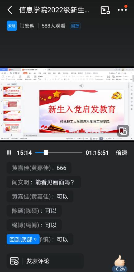 对大学生加强党的基本知识教育,提高大学生对中国共产党的认识和了解是加强和改进大学生思想政治教育工作的重要内容。9月13日上午,我院开展2022级新生入党启发教育。本次入党启发教育由学院党委专职组织员阎安明同志主讲,以钉钉直播的方式开展,全体2022级新生参加听课。 阎安明同志从中国共产党是什么样的政党、为什么要在大学生中发展党员、发展党员的程序是什么、发展党员的有关材料撰写等等,他深入浅出、细致全面地介绍了大学生党员发展重要环节,强调大学生入党是党的事业发展的需要,是积极承担历史重任的需要,也是实现自身成长成才的需要,对进一步增进大学生对党的认识,进一步端正大学生入党动机,进一步增强大学生创新性学习的思想动力,以实际行动向党组织靠拢具有积极意义。 讲课结束后,阎安明同志与2022级新生进行了线上交流与讨论。 线上培训课截图