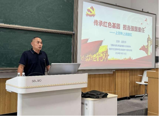 10月18日,雁山校区06509教室里人头攒动座无虚席,“传承红色基因,担当强国重任”报告会在这里举行,受学院邀请,原空降兵某训练基地大校参谋长,现广西军休干部宣讲团成员、桂林市五里厅军休所军休干部赵东升,为我院师生作了一场革命传统教育专题报告。报告会由学院副处级党建组织员阎安明老师主持,学院党委书记熊英、党委副书记黎超业,以及各师生支部委员、各班级学生代表约250余人参加。 报告会上,赵东升以《传承红色基因 担当强国重任——上甘岭上战旗红》为题,从最丢面子的摊牌、最惨烈的战役、最可敬的英雄、最震撼的精神、最伟大的斗争等五个方面,饱含深情地为师生们讲述了抗美援朝战争中荡气回肠、气壮山河的上甘岭战役,他以直观的图片、生动的事例、详实的数据为媒介,为大家再现了波澜壮阔、惊心动魄的历史图景。讲述中赵东升鼓励学院师生要继承和弘扬伟大建党精神,怀揣“逢山开路、遇水架桥”的决心,不畏困难、敢于担当,积极作为、砥砺前行,为全面推进中国式现代化建设贡献智慧和力量。 报告会后,师生们纷纷表示,聆听此次报告仿佛穿越时空、亲历战役,让人热血沸腾、备受鼓舞,对革命先烈不畏艰险、英勇斗争的精神有了更深刻的感悟,并决心以实际行动继承和发扬革命先辈的光荣传统和优良作风,把红色基因融入学习和生活之中,以更加饱满的热情和更加坚定的信念,为实现中华民族伟大复兴而不懈奋斗。 此次报告会,标志着学院“传承红色基因、学思践悟中国共产党人精神谱系”系列教育活动的正式启动。接下来,学院将运用好、传承好红色基因,教育引导师生增强践行“两个维护”的政治自觉思想自觉行动自觉,坚定爱国奋斗挺膺担当,在为国尽责、为民服务中实现个人价值、展现人生风采。 会议现场一 会议现场二 (一审:李荣胜;二审:阎安明;三审:熊 英)