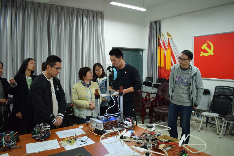 活动上,我院学生第四党支部党员们向大家展示了智能车、电磁炮、电子感应器、3D打印机、无人机等作品。本次科技作品展内容丰富,覆盖面广,包含“挑战杯”全国大学生系列科技学术竞赛、全国电子设计大赛等赛事的多个优秀获奖作品,每个展位的作品都独具风格,吸引着同学驻足参观。其中,党员同志对无人机、3D打印机这两个展品现场演示和详细解说,激发了同学们的好奇心和求知欲,诠释了科技创新的魅力。党员们在现场和老师、同学们交流互动,并向大家分享开发心得。在党员们细心的讲解介绍下,同学们对科技作品及科技竞赛有了初步了解,对科技作品的工作原理和应用前景又有了更深入的了解。
