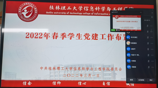 3月1日晚,我院在钉钉平台线上召开了学生党建工作例会,学院副处级专职组织员阎安明老师、学生党支部全体支委参加,会议由学院党建中心黄行健老师主持。 会上,黄行健老师就2021年学生党建工作进行回顾,对上一年党建工作所取得的成绩与不足进行总结,他希望全院学生党员严于律己,树立争先意识,在学习上、工作上争做表率。同时,他对拟组织开展的党支部组织生活会和党员民主评议、主题党日活动等提出工作要求。 阎安明老师作总结讲话,他指出,学生党支部是学院学生党建的组织者、策划者、实施者,务必不折不扣地落实好学院党委的各项决策部署和工作要求,为此,工作中一是要力求精细化、规范化、制度化,要防止出现人为工作疏忽;二是要进一步提高政治站位,强化党支部党建工作主体责任;三是要不断加强理论学习,切实提升支委工作能力,为确保学生党建工作取得新成效奠定可靠基础。 在线会议截图