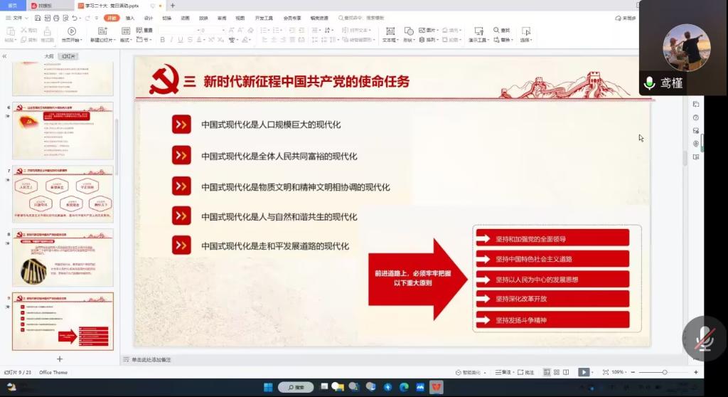 为深入学习贯彻党的二十大精神和习近平总书记系列重要讲话精神,2022年11月22日,计算机第一学生党支部开展“深入贯彻学习党的二十大精神”主题党日活动。受疫情影响,本次活动转为线上,支部全体党员参加,支部副书记钟美薇主持。 钟美薇同志领学了党的二十大报告原文,全面回顾党和国家自十九大以来取得的伟大历史成就和新时代十年的伟大变革,科学擘画了未来中国的发展蓝图。着重学习了关于“实施科教兴国战略,强化现代会建设人才支撑”篇目。钟美薇强调,科技是第一生产力,人才是第一资源、创新是第一动力,党对青年寄予厚望,同志们要认真领会领悟党的二十大精神实质,不断从中国共产党的发展历程中汲取经验,把理论学习与自己的学习生活相结合,在感悟中学、在实践中学,坚持自主创新,争做担当民族复兴大任的信息化时代新人。 此次主题党日活动的开展,同志们更加深刻地认识到作为新时代的新青年,要坚定不移听党话、跟党走,怀抱梦想又脚踏实地,敢想敢为又善作善成,立志做有理想、敢担当、能吃苦、肯奋斗的新时代好青年,让青春在全面建设社会主义现代化国家的火热实践中绽放绚丽之花。 线上主题党日活动现场