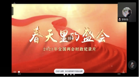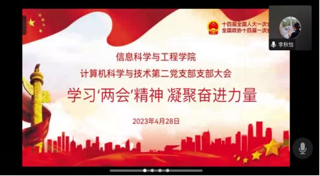为深入学习贯彻“两会”精神,学深悟透“两会”要点,准确把握时代脉搏,4月28日,计算机学生第二党支部开展了“学习‘两会’精神 凝聚奋进力量”主题党日活动。活动由党支部书记李秋怡主持,支部全体党员参与会议。 活动伊始,李秋怡带领支部全体党员深入学习了2023年全国“两会”期间习近平总书记发表的重要讲话精神及全国“两会”精神,她指出,从党的二十大到全国“两会”,宏伟蓝图鼓舞人心,时代号角催人奋进,支部全体党员要将“两会”精神落实到日常学习工作中,争做学习宣传贯彻“两会”精神的践行者;要积极发挥党员先锋模范作用,砥砺奋进,笃行实干,以饱满的精神状态、高昂的学习热情展现新担当新作为。 之后,与会党员共同观看了2023年全国两会时政记录片《春天里的盛会》,并分别结合个人实际交流了学习贯彻“两会”精神的心得和感悟。 活动现场(一) 活动现场(二)