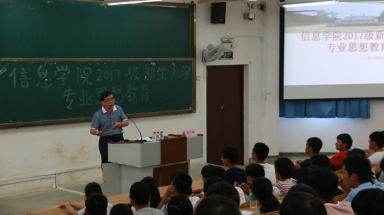 9月29日下午,我院院长程小辉教授在07119教室开展“新生入学专业思想教育”专题讲座。本次讲座由17级辅导员沈老师主持,全体新生共同参与。 首先,我院院长程小辉教授从学院大类专业开始介绍,分别阐述了电子信息类和计算机类之间的联系,以及两大专业的人才培养方向。其次,程小辉院长又给新生们详细地分析了计算机类专业分流、电信和计算机专业人才需求和就业方向,同时为同学们讲解了人生规划,希望同学们在度过大学生活的同时,为自己制定一个人生目标,做好职业规划,打牢专业知识,树立正确的人生观、价值观,程院长的发言获得同学们阵阵掌声。最后,本次讲座在程院长的祝福和希望中结束。 本次讲座为我院新生充分普及了信息类专业的背景和前景知识,让新生对信息类专业有了新的认识,对于明确人生目标和制定专业规划打下良好的基础。