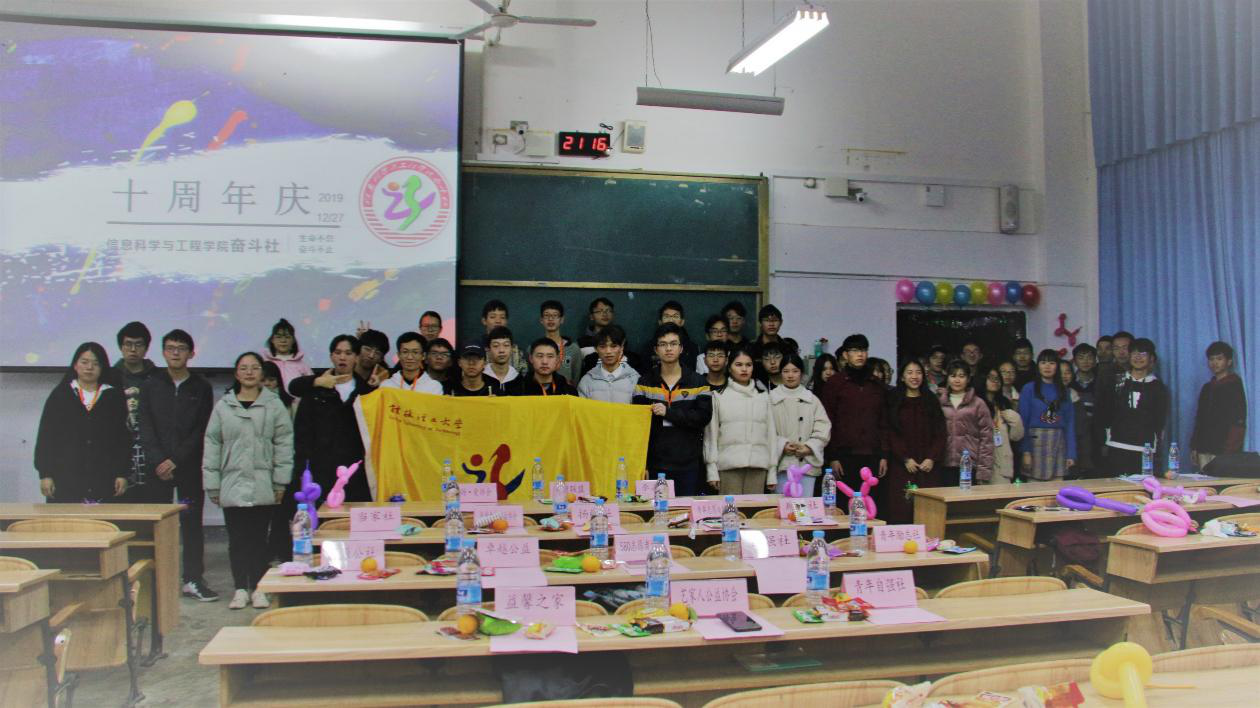 为回顾奋斗社十年来的风雨兼程,提升奋斗社的凝聚力,更好的展望未来,我院奋斗社于2019年12月27日晚在雁山校区06206成功举办十周年庆祝活动。学院各班级家庭经济困难学生、各学院相关社团代表参加了活动。 活动伊始,奋斗社播放历史活动视频,李嘉永同学代表奋斗社总结了奋斗社成立以来资助育人工作、志愿服务工作中取得的成绩,提出了2020年的工作目标,即提高组织能力,提升活动水平,更好服务同学。接下来同学们以一首激动人心的歌曲进行暖场,调动活动气氛。活动的高潮阶段便是节目表演时段,奋斗社成员们自编自排的节目一一登场,有团结奋进的合作游戏、有旋律优美的歌曲、也有壮志满怀的朗诵,随着节目的演出,同学们热情高涨,掌声不断。 通过此次活动,增强了奋斗社的团体意识和凝聚力,扩大了社团影响力,开拓了今后工作的思路,祝愿奋斗社在今后的发展得更加辉煌与美好。 十周年庆祝活动合影