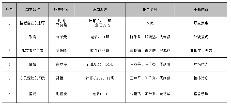 为深入推进我院大学生心理健康教育工作,提高学生心理健康水平,营造阳光、健康的心理育人氛围。近日,学院邀请学工处分管学校大学生心理健康教育的孙巍副处长组成评审组对征集到的心理情景剧本进行评审,最终遴选出其中的6个剧本参加现场决赛。 信息科学与工程学院高度重视学生心理健康教育工作,学院学工办从去年12月开始面向学院全体学生发出了举办大学生心理情景剧大赛通知,这次评选出的六个剧本分别以宿舍矛盾、珍惜时光、性格治愈、外貌焦虑、原生家庭、抑郁症等为主题,生动直观地再现了大学生日常生活中常见的心理冲突和心理困扰。筹备此次心理情景剧大赛,旨在通过同学们喜闻乐见的方式强化心理健康教育工作,提升教育水平。据悉,学院将在3月中旬组织开展心理情景剧现场演绎工作。 本次评审结果如下(排序不分先后):