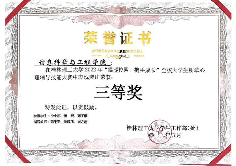 5月6日晚,由太阳成集团tyc151cc心理健康教育与咨询中心主办,环境科学与工程学院承办的2022年“温暖校园,携手成长”全校大学生朋辈心理辅导技能大赛决赛在雁山校区图书馆报告厅举行。经过主题班会视频展示、心理健康知识测试两个环节,最终各学院共11个队伍晋级现场决赛。学院由钟小惠、黄琨、刘子豪三名同学组成的代表队以突出的表现荣获此次大赛三等奖。 主题班会视频展示中,学院代表队组织电子信息类2021-6班同学开展了以“走进心理咨询室”为主题的班会拍摄。该主题班会的设计旨在带领同学们了解心理咨询,破除同学们对心理咨询的偏见,增加同学们的积极求助意识,提升同学们的心理健康素质。现场决赛环节为朋辈心理辅导展示,学院参赛选手用自己的耐心、爱心与专业知识向现场评委与观众展现了一名心理委员应具备的素质与能力,最终打动了案例扮演者,受到了评委老师好评并获得较好成绩。 本次获奖既是对我院朋辈组织以及心理委员专业素养的充分肯定,也是对我院心理健康教育工作成效的认可。本次比赛提升了学院朋辈组织及心理委员的专业能力,增加了学院学子的心理健康知识素养,强化了学院学子的心理健康互助意识,为学院心理健康教育奠定了良好基础。