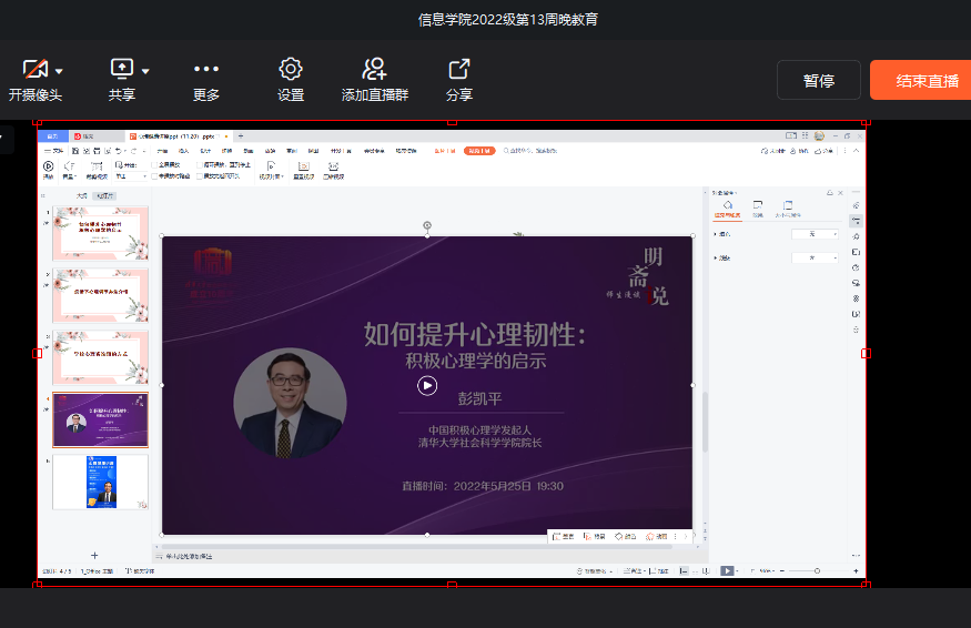 为帮助学生化解近期疫情诱发的心理困扰,引导学生保持科学认识疫情、理性平和面对疫情的积极心态,11月20日,学院通过晚教育开展心理健康在线讲座,讲座以播放清华大学彭凯平教授主讲的《如何提升心理韧性:积极心理学的启示》的主题讲座视频和各年级辅导员主讲的形式进行。 讲座开始,由各年级辅导强调本次线上讲座的目的,接下来放映清华大学彭凯平教授主讲的《如何提升心理韧性:积极心理学的启示》的讲座录播视频,彭教授的讲座教会了同学们控制负面情绪的八种方法。随后由各年级辅导员向同学们介绍疫情下心理调节的办法和学校心理咨询中心的预约方式,并鼓励同学们在有心理困扰时要敢于求助。 本次心理健康教育主题讲座促进了我院学生在疫情期间对心理健康防护知识的了解,帮助学生调整心理状态,保证疫情期间学习生活的有序开展。