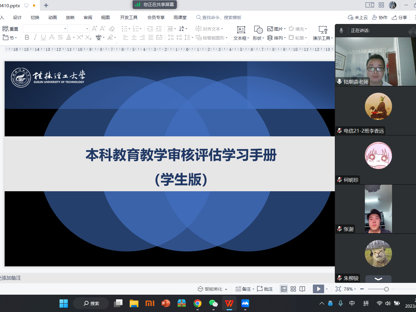 为深入贯彻落实学校关于新一轮本科教育教学审核评估工作精神,从容不迫迎接审核评估,5月上旬,学院多举措开展“本科教育教学审核评估”专题学习活动,强化评估基础知识的掌握,提升学生对此次评估的重要性认识和参与积极性,进一步培养学生的爱校荣校意识。 学院形成了集中学习与自学相结合、线上与线下相结合、学习与测试相结合的学习模式,充分利用成长成才教育课、主题班会、座谈会、社区、新媒体公众号等载体,发挥辅导员、班主任、学生党员、学生干部、宿舍长的模范带头作用,创新线上知识竞赛等高效学习方式,号召学生应主动深入学习《本科教育教学审核评估学习手册(学生版)》,认识到自己是评估的最大受益者,以高度的责任感、使命感和强烈的担当精神投入到评建工作中,以积极的姿态迎接审核评估,为学校献光彩,为评估作贡献。 学院将继续全面深入开展“本科教育教学审核评估”专题学习活动,并将以此次审核评估工作为契机,牢牢把握立德树人根本任务,进一步创新人才培养模式,健全人才培养的管理制度,完善本科教学质量保障机制,以评促建、以评促改、以评促管、以评促强,推动学院高质量内涵式发展。 小班学习现场 线上主题班会现场