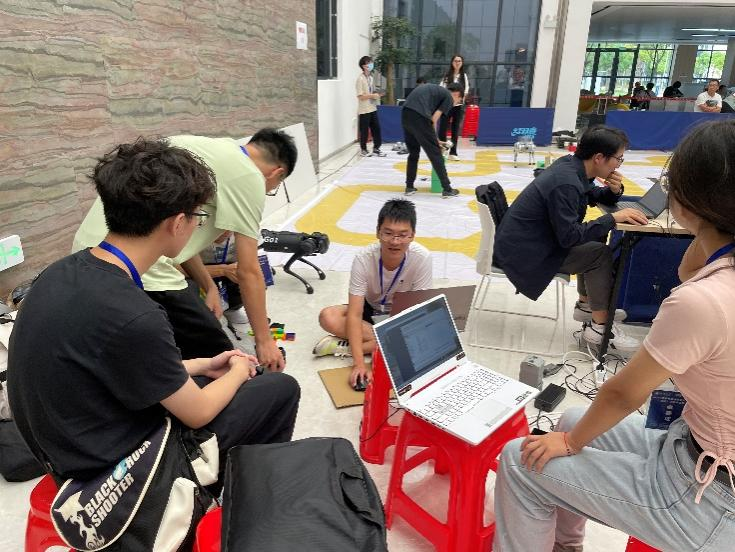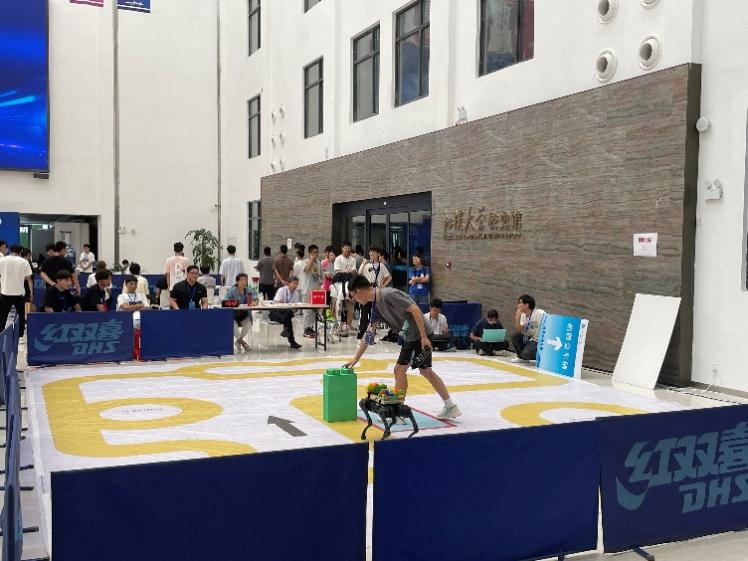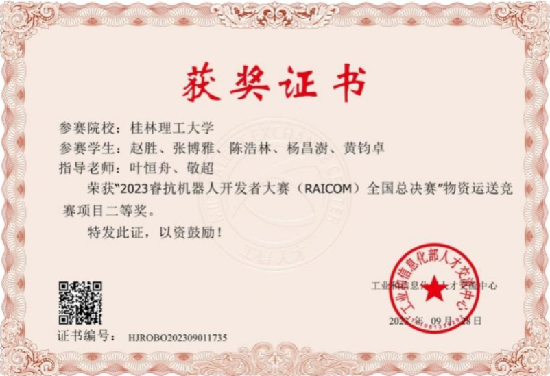近日,2023睿抗机器人开发者大赛(湖北)全国总决赛落幕。此次大赛吸引了来自全国28个省市、200余所高校的优胜队伍、800多名选手参赛。该赛事由工业和信息化部人才交流中心等主办,江汉大学、武汉职业技术学院等承办。由学院叶恒舟老师、敬超老师指导,本科生赵胜、张博雅、陈浩林、杨昌澍、黄钧卓组成的桂工哇酷哇酷小队,经过不懈努力、顽强拼搏,在物资运送赛项中荣获全国二等奖,这是学院师生在此赛项中首次获得全国奖。 物资运送赛项主要是通过编程控制四足机器人(机器狗)完成路径规划、路线识别、物资运送、障碍物躲避等一系列任务,将机器视觉、智能感知与四足机器人结合,重点培养参赛队员的编程、算法设计及优化、任务规划和团队组织协作能力。 此项赛事得到了学校的高度重视,通过学校教务处统筹,测绘学院和体育教学部予以场地支持,学院领导、辅导员及专任教师的协调下,自今年3月起开始选拔学生参赛,充分利用空余时间和暑假进行训练。在此前的区赛中就获得了一等奖和三等奖各1项。 获奖证书 赛前场地调试与讨论 赛中测试 比赛合影