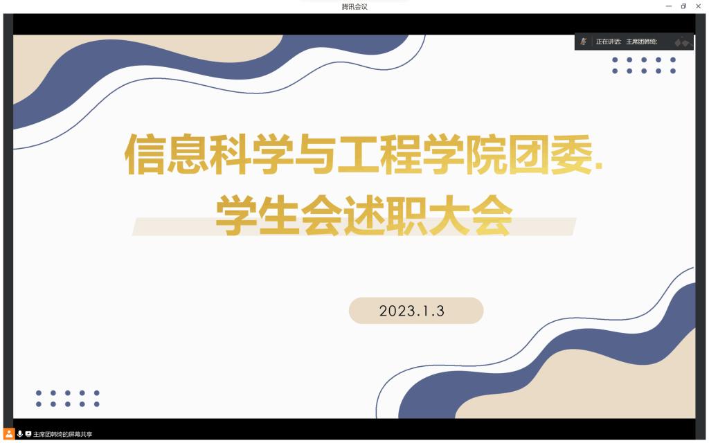 为加强学院团委·学生会组织建设,切实提高学生干部能力水平,1月3日,太阳成集团tyc151cc召开团委·学生会2022年述职大会。学院学生会2020级、2021级全体成员参加本次会议。 大会上,首先由主席团韩绮介绍此次述职大会的作用及意义;随后,学生会各部门和学生会的各部门干事进行述职,他们全面、客观地总结了过去一年的工作和成绩,同时,对工作目标的完成情况进行了反思,对自身存在的问题进行了深刻地自我批评。 本次述职大会的召开不仅有利于学院团委·学生会总结工作经验,更好地开展新学年的工作,而且对于促进全体团委·学生会成员自我认识、自我学习、自我提高有着重要的推动作用。 线上述职大会