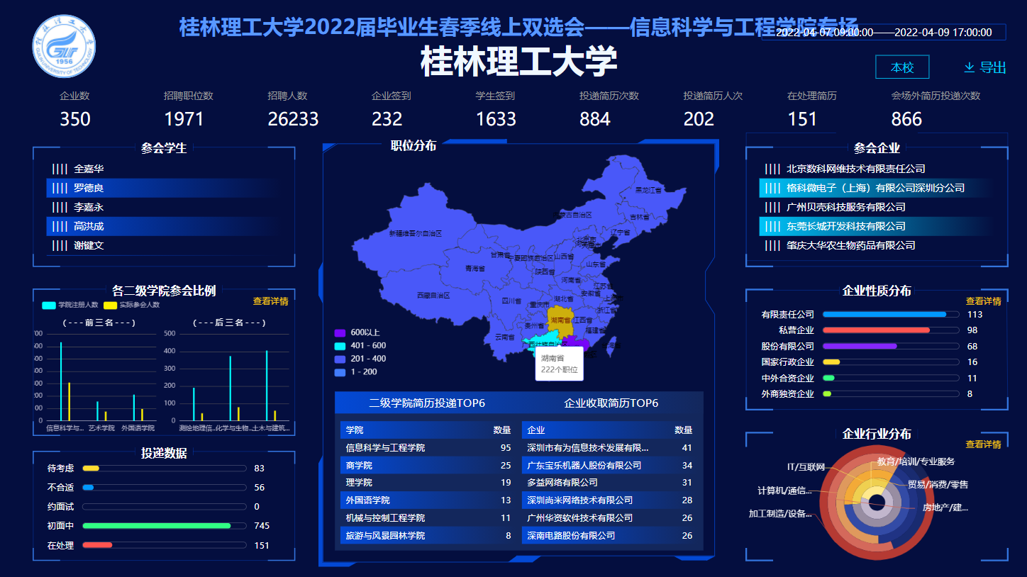 为贯彻落实党中央、国务院关于高校毕业生就业工作的重要部署,全力做好新型冠状病毒感染肺炎疫情防控时期的毕业生就业工作。4月7日--9日,信息科学与工程学院顺利举办“太阳成集团tyc151cc2022届毕业生春季线上双选会——信息科学与工程学院专场双选会”。 本次线上双选会为用人单位与毕业生搭建安全、便捷、高效的交流平台,充分利用信息化手段推进就业工作,积极开展线上就业服务,切实保障毕业生就业权益、提高毕业生就业质量,推送信息科学与工程学院毕业生就业,此次双选会吸引350余家用人单位参会,提供岗位1971个,招聘人数达2.62万人。 信息科学与工程学院高度重视毕业生就业工作,积极拓展就业渠道,不断完善就业服务,全力做好就业指导和跟踪反馈工作,将继续认真贯彻落实上级有关部门和学校相关工作要求,努力做到就业服务不断线、招聘工作不掉链、精准帮扶不松劲,扎实推进学院2022届毕业生就业工作顺利开展。 专场双选会活动(一) 专场双选会数据统计(二)