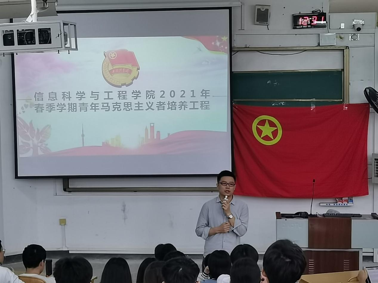 为深入贯彻落实习近平新时代中国特色社会主义思想,推进“青年马克思主义者培养工程”的实施,学院于2021年5月25日在雁山校区05102教室举行2021年春季学期青年马克思主义者培养工程大学生骨干培训班,学院团委李艮、王发老师主讲,全体学员80余人参加。 学院团委副书记王发老师强调在两个一百年的历史交汇期,团学组织工作人员要学史明理、学史增信、学史崇德、学史力行,传承红色基因。他带领同学们回顾了百年党史的光辉历程,让学员对中国共产党的建立、中华人民共和国的成立、改革开放和中国特色社会主义事业有了更加深刻的认识。我院 “青年马克思主义者”培训班在今后的培训中,将在理论学习的基础上,以“社会实践、志愿服务和创新创业”为主题实践,引导新时代“青马人”在实践中践行责任和使命,让广大青年坚定理想信念,牢记初心使命,为中华民族伟大复兴的中国梦不懈努力。 会议现场(一) 会议现场(二)