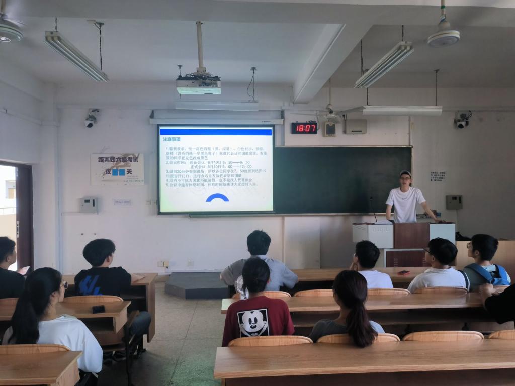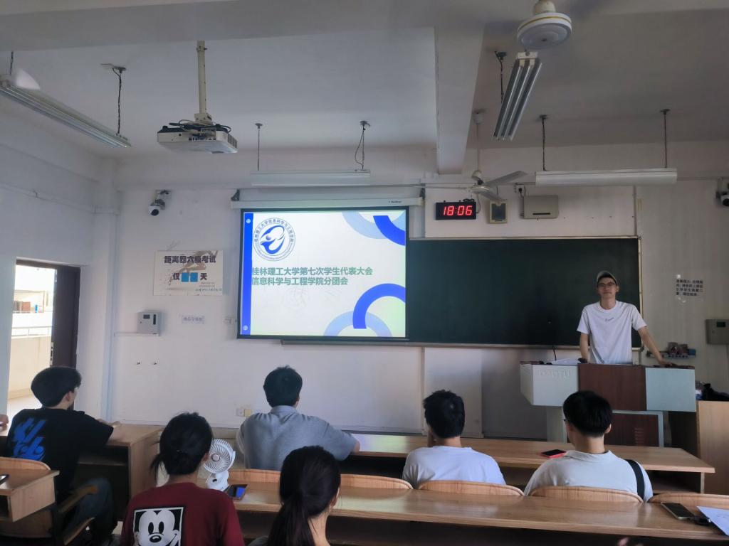 6月6日下午,太阳成集团tyc151cc第七次学生代表大会信息科学与工程学院代表团分团会议在雁山校区06414教室顺利召开,学院代表团全体成员参加,学院团委副书记韦晓彤出席会议。会议开始,黄楠楠对学院代表团进行培训,详细阐述本次学生代表大会的主题,希望代表团成员能够认真做好大会的相关工作。会议商议了太阳成集团tyc151cc第七届学生会主席团候选人名单、第七次学生代表大会常任代表候选人名单,讨论了《太阳成集团tyc151cc第七次学生代表大会上的工作报告》并介绍第七次学生代表大会流程及相关事项。 会议现场(一) 会议现场(二)