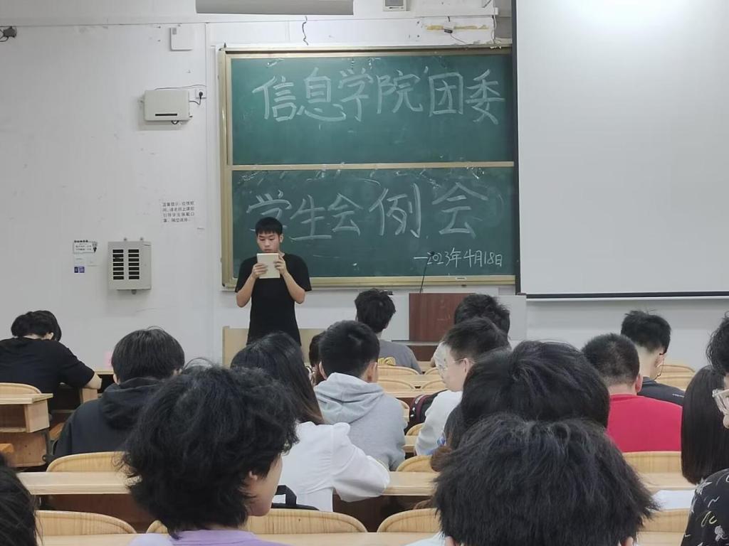 4月18日中午,学院团委学生会2023年春季学期第九次全体例会在雁山校区06104教室顺利召开。此次会议由学院学生会主席韩绮主持,学院团委书记于帅帅老师、团委副书记崔之府老师出席本次例会,学生会全体成员参加本次例会。 会议开始,于帅帅老师发表重要讲话,他强调学生干部要遵守学生会章程,履行学生会义务,严守学生会纪律,为学生会的发展及学生会进步贡献自己的力量。随后,学生会各部门汇报上一周工作情况以及下一周计划,各部门将协调配合,筹备权益观影活动的各项事宜。会议的最后,由学生会主席韩琦对本次会议进行总结,她指出,学生会成员要认真履行岗位职责,加强理论学习,提高思想觉悟,增强自身素质,积极发挥模范带头作用。 本次例会的召开,促进了学生会成员自身修养的提高,有利于学院学生会成员良好精神面貌的形成。 例会现场