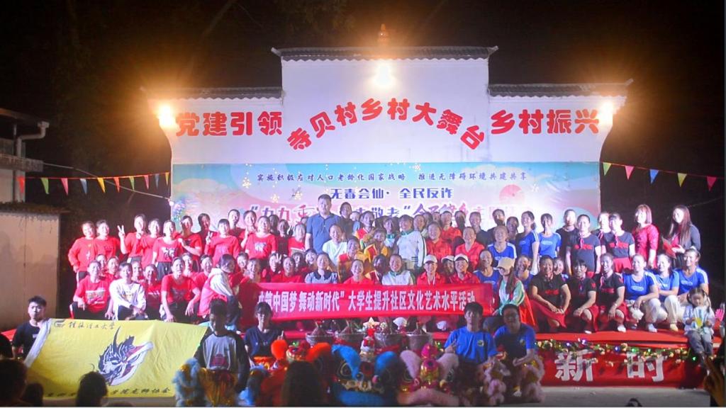 为发扬中华民族敬老爱老的传统美德、丰富和发展传统龙狮文化,10月23日,学院龙狮协会的同学们在于帅帅老师的带领下,趁着暮色来到了会仙镇乡村振兴晚会的现场,为会仙社区的居民带来了一场热闹非凡、震撼人心的龙狮展演活动。 抵达会仙社区后,同学们为会仙社区居民进行了祈福活动,瑞狮跟随着震撼的鼓点舞动跳跃,为农户祈望生活吉祥如意、事事平安。龙狮展演在震撼磅礴的鼓声中拉开序幕。龙狮协会为现场群众展示“群狮报喜”“瑞狮点睛”“麒麟步”“挂腰接上腿”“高狮”等一系列龙狮表演动作,时而昂首阔步,时而翻腾扭转,一幕接一幕将狮生动的生态展现得淋漓尽致。高超的技艺赢得了现场群众的一片喝彩,展现了龙狮人坚韧不拔、勇往直前的精神面貌,也进一步点燃了大家的激情。 经过此次活动,我们弘扬了重阳节爱老敬老的传统美德,也传播了中华传统的龙狮文化,让居民更好地感受龙狮优秀传统文化的底蕴和魅力,增强文化自信,让传统文化焕发新的活力,培养新时代文化传承接班人,实现了龙狮文化与爱老敬老的精彩联动。 学院展演人员 展演现场 活动合影